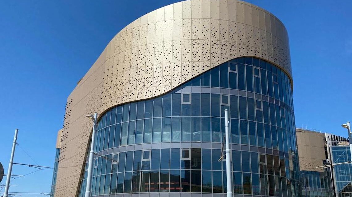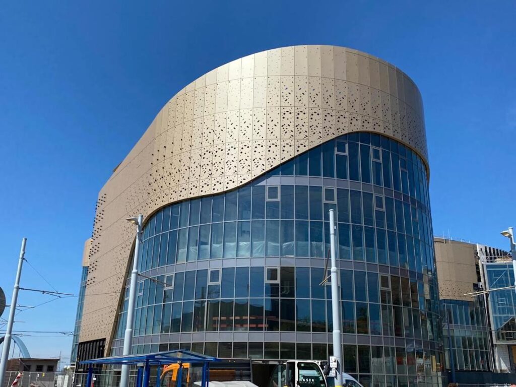 Eine weitere Herausforderung bestand darin, die beiden Verfahren der Spritzlackierung und der Bandbeschichtung so zu kombinieren, dass das Center innen wie aussen in der gleichen Farbe erstrahlt. Heisst: Gewisse Teile mussten bandbeschichtet, andere wiederum spritzlackiert werden. Und das Resultat lässt sich heute durchaus sehen: die Lochblech-Fassade strahlt in einem kräftigen aber diskret zurückhaltenden Gold, das dem Gebäude dadurch innen wie auch aussen eine Leichtigkeit verleiht. Das sahen auch die Gäste, die Ende September 2022 bei der Eröffnung nach fast vier Jahren Bauzeit des Einkauftempels zugegen waren.