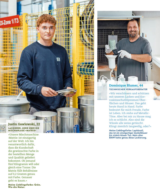 Im Color Lab in Fislisbach entstehen täglich neue Nuancen. Architektinnen und Bauherrschaften mischen gemeinsam mit den Spezialisten vor Ort individuelle Farbtöne. Justin Gawlowski, Lackierer, überwacht die Mischanlage «Matrix» und sorgt dafür, dass Farben bis auf 0,2 Gramm genau in der richtigen Menge und Qualität abgefüllt werden. «Genauer geht es kaum», sagt er. Seine Lieblingsfarbe ist Grün, wie die Natur. Hier arbeiten Menschen, die Farbe nicht nur herstellen, sondern leben. Dominique Blumer, technischer Verkaufsberater, verschönert und schützt mit Lacken und Korrosionsschutzsystemen Oberflächen und Häuser. Für ihn bedeutet Farbe Freude und Kreativität, auch wenn zuhause alles bewusst zurückhaltend bleibt.